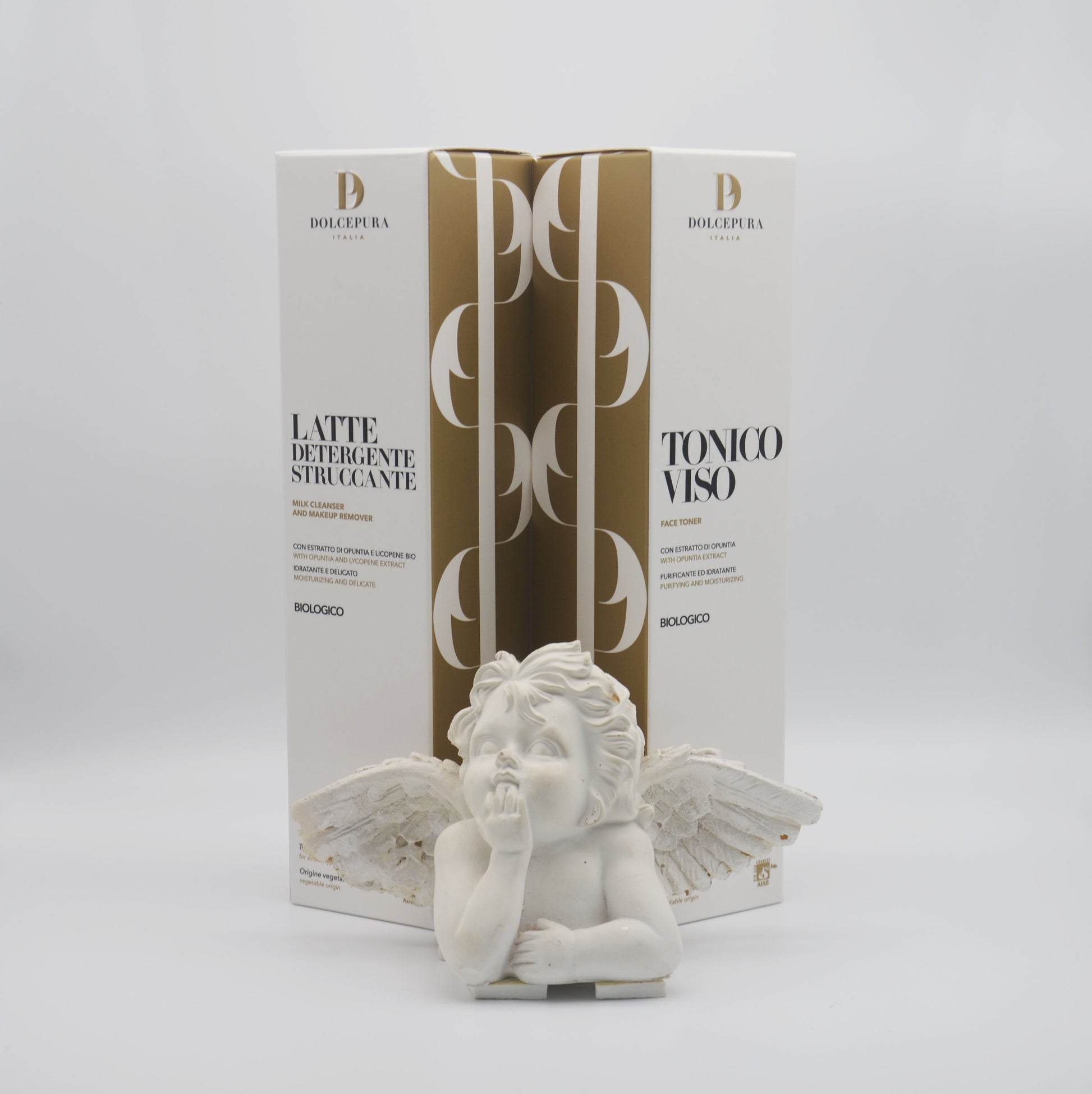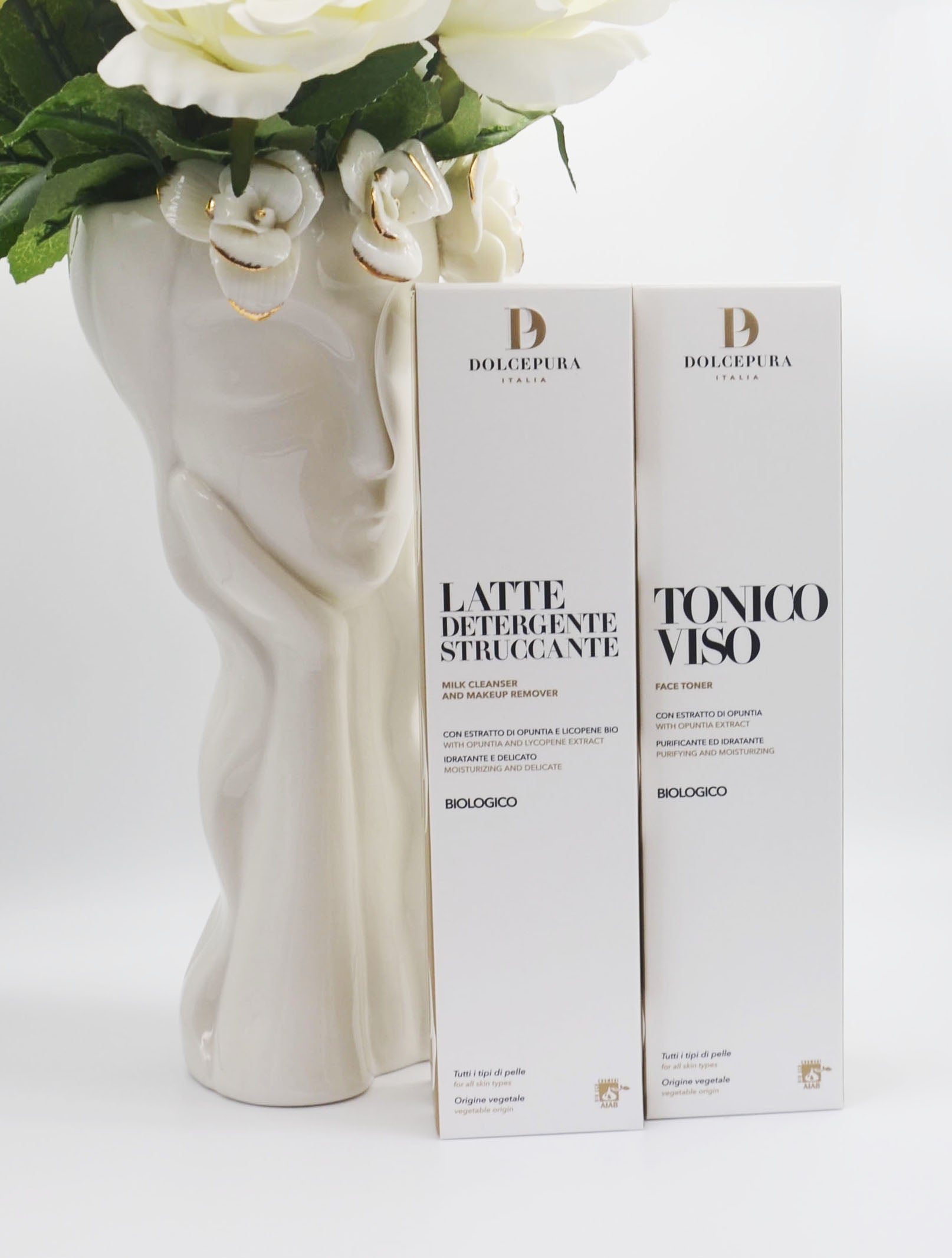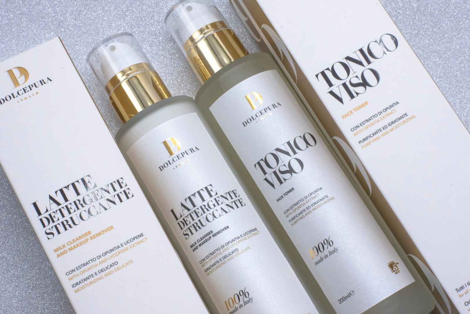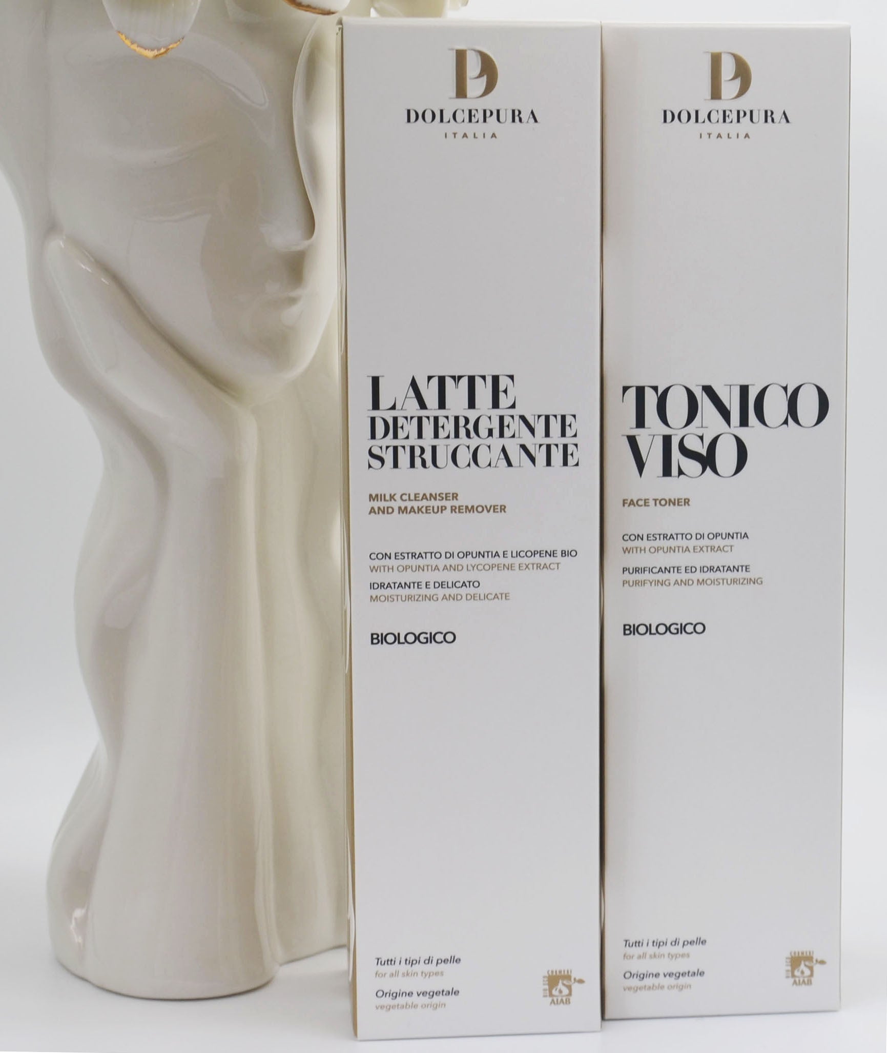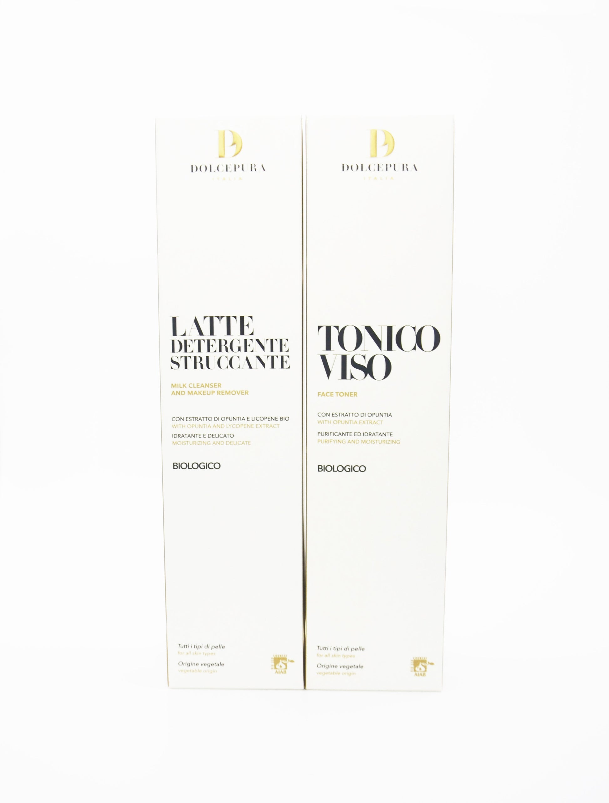 Set DolcePura "DETERGENZA" pentru FAȚĂ (lapte demachiant si tonic) cu extract de opuntia și licopen (cu licență), organic pe bază de plante, pentru toate tipurile de piele. Produse realizate manual în Italia